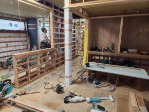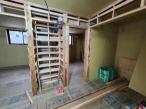 状況としましては、電気屋さんが間仕切壁内部に配線作業設備屋さんが器具用の下地材の仕込み大工さんが各種造作材を取り付けて壁ボード張りの準備を行っていました!
